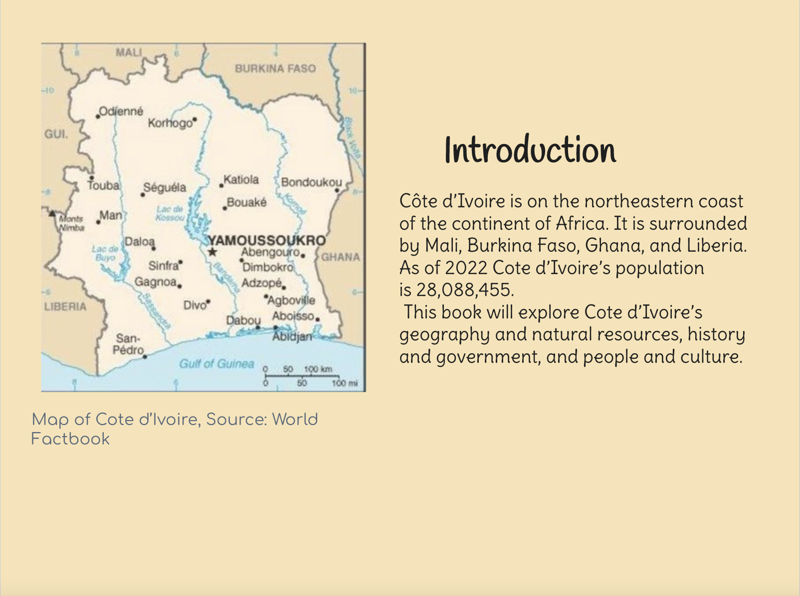 My role was primarily to provide students with introductions to different research sources, and provide technology support for the final project. These lessons took place in the form of resource scavenger hunts for World Book Encyclopedia and CIA World Factbook. There was also a lesson on curating images from reliable sources and building basic image citations using a template worksheet. I also developed the lesson for the final showcase of their work – which was a digital book created in the Book Creator digital program. These books contained the text from their research paper, as well as their curated images.