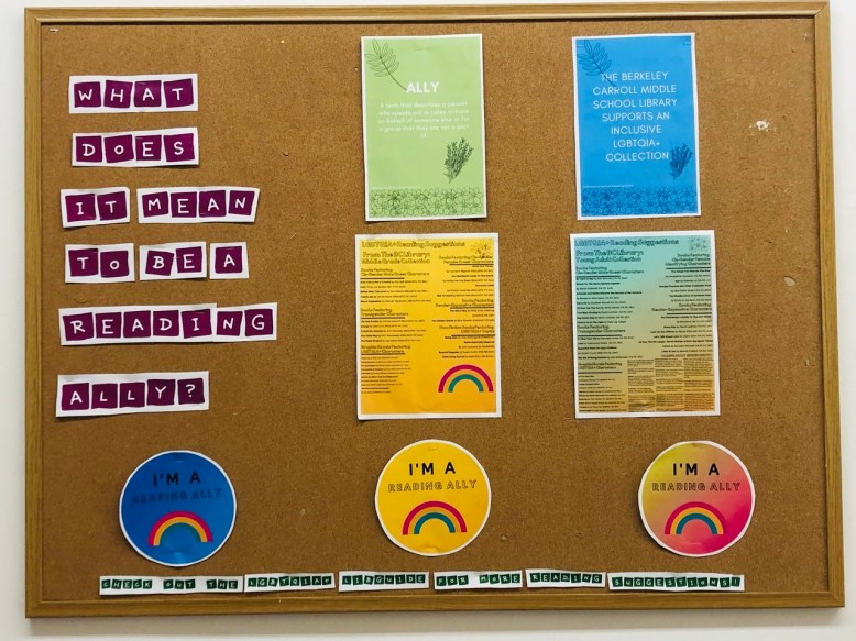 What does it mean to be a Reading Ally? The 6th Graders are finding out right now! As part of the 6th Grade Science curriculum, each student is reading a book (of their choice) featuring a character with a gender identity that is different from straight & cisgender. This bulletin board features our Reading Ally reading lists, and some more info on the project.