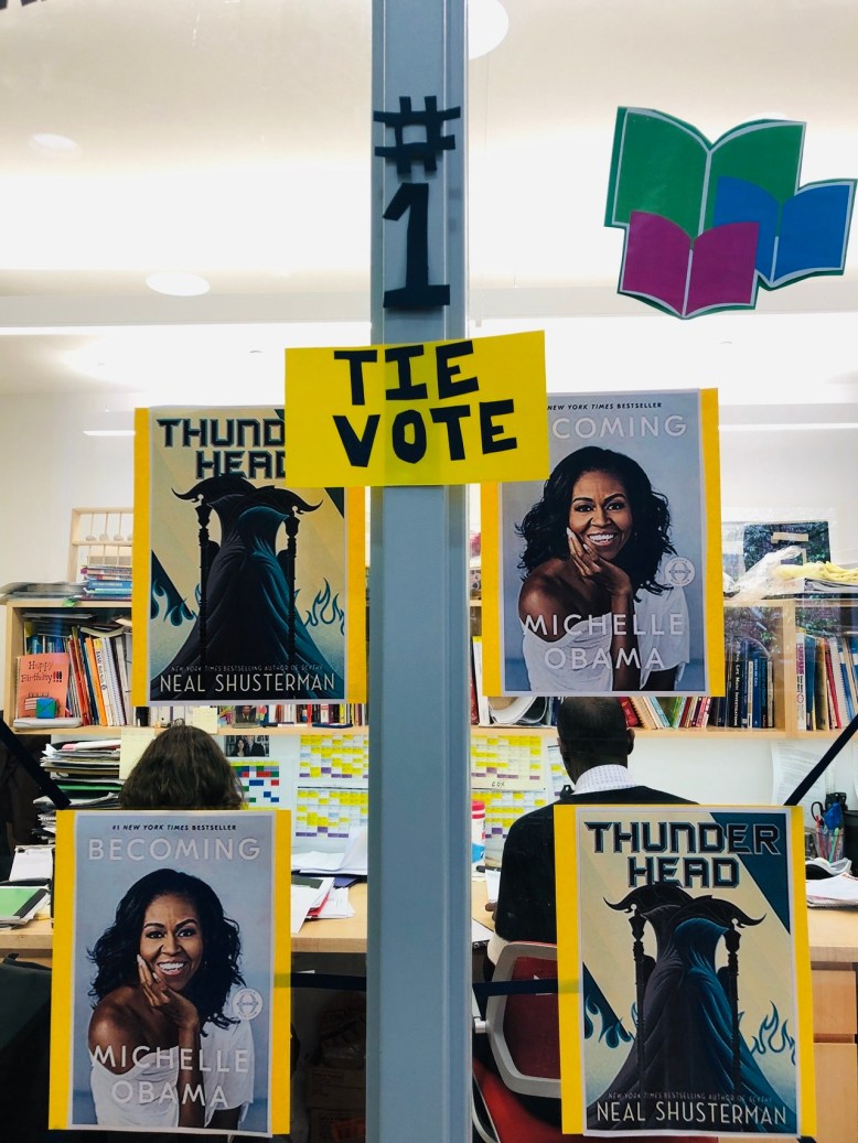 In a surprising turn of events, we had a TIE VOTE result for 2019 BC Book Madness! With exactly 64 votes for Thunderhead by Neal Shusterman & 64 votes for Becoming by Michelle Obama, we decided to call it as an official tie! Thank you to everyone who showed their extreme support for the competition, and voted in one or all of the rounds! We can’t wait to do it again next March.