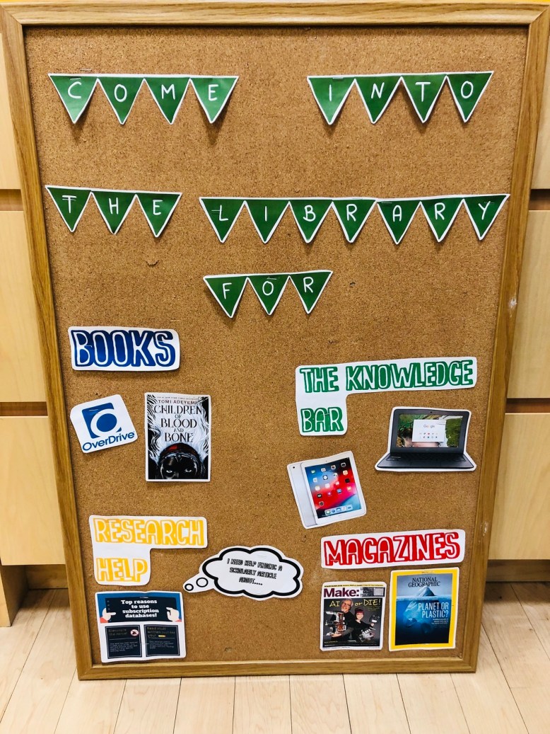 Our new year bulletin board reminds middle school students & faculty of everything the library has to offer! Library benefits include:
